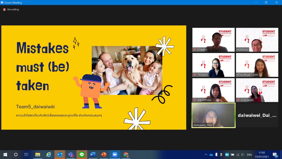 ผลงาน “Mistakes must (be) taken” ที่บอกเล่าความเข้าใจผิดเกี่ยวกับการดูแลสัตว์เลี้ยงของคนรักสัตว์ พร้อมแนะนำให้เข้าใจถูกต้อง และแก้ไขผ่านกิจกรรมสนุกๆ โดยให้เจ้าของสัตว์เลี้ยงได้ทดลองทำทันที (Call to Action) จาก ทีม Dai Wai Wèi คณะสัตวแพทย์ศาสตร์ มหาวิทยาลัยเกษตรศาสตร์ โดย น.ส. พิมพ์วิภา วุฒิ และ น.ส. ณฐพรรณ เดิมกะยอม ตอบโจทย์การสร้างความตระหนักถึงความสำคัญของโภชนาการสัตว์เลี้ยง ผ่านการเล่าเรื่องยากให้เป็นเรื่องง่าย สร้างความประทับใจให้คณะกรรมการจนได้รับรางวัลชนะเลิศอันดับ 1 ไปครอง