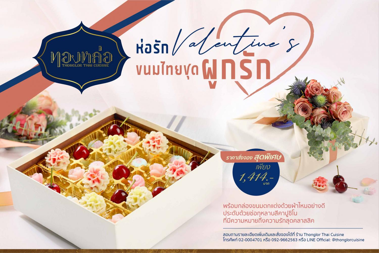 อีกหนึ่งชุดสำหรับวันวาเลนไทน์สุดพิเศษ “ทองหล่อ” ขอแนะนำของขวัญขนมไทยแสนหวานในชื่อชุด “ห่อรัก วาเลนไทน์” แต่งเติมความหวานอย่างไทยจากชุดผูกรักที่ผสมผสานความสวยหวานจากกล่องขนมผูกด้วยผ้าไหมอย่างดีที่ประดับด้วยช่อกุหลาบสีคาปูชิโนที่สื่อถึงความรักสุดคลาสสิก ภายในเป็นกล่องของขวัญที่มีขนมไทยความหมายแฝงไว้ซึ่งความน่ารัก อาทิ ลูกชุบเชอรี่ สื่อถึงความทะนุถนอม ความรักยึดมั่น และเมนูต่อมา กลีบผกากรอง สื่อถึงความรักที่เบ่งบานและงดงาม เมนูต่อมา สัมปันนี สื่อถึงความคิดถึง ความรัก ความห่วงใย และปิดท้ายด้วย กุหลาบชาววัง สื่อถึง ความรักอันหอมหวาน สั่งจองได้ในราคาเพียง 1,414 บาท