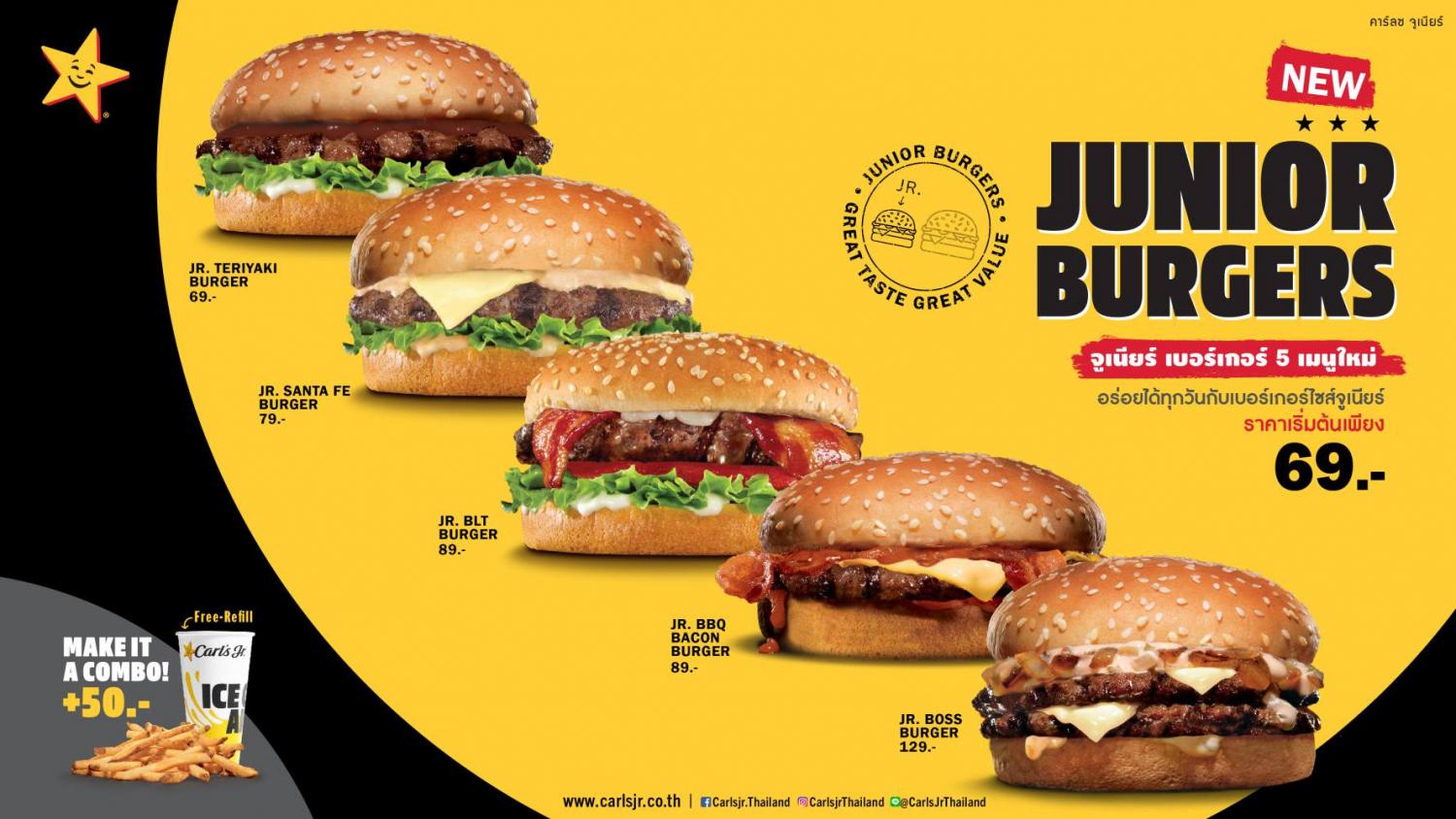 คาร์ลซ จูเนียร์ ชวนลิ้มลองความอร่อยแบบใหม่ กับ คาร์ลซ จูเนียร์ เบอร์เกอร์ เมนูลูกผสมจากคาร์ลซ จูเนียร์ ที่จับคู่ระหว่างซิกเนเจอร์เบอร์เกอร์กับจูเนียร์เบอร์เกอร์ เพื่อให้ได้ลิ้มลองซิกเนเจอร์เบอร์เกอร์ในขนาดที่เล็กลง แต่ยังจัดเต็มทั้งคุณภาพและราคาที่ต้องตามไปโดน!!
