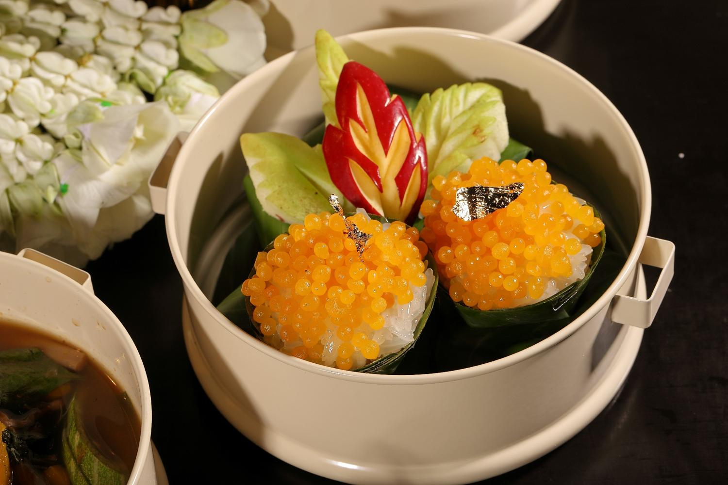 ชั้นเครื่องหวาน: ผลไม้แกะสลัก ข้าวเหนียวหน้าไข่แมงดาเทียม
