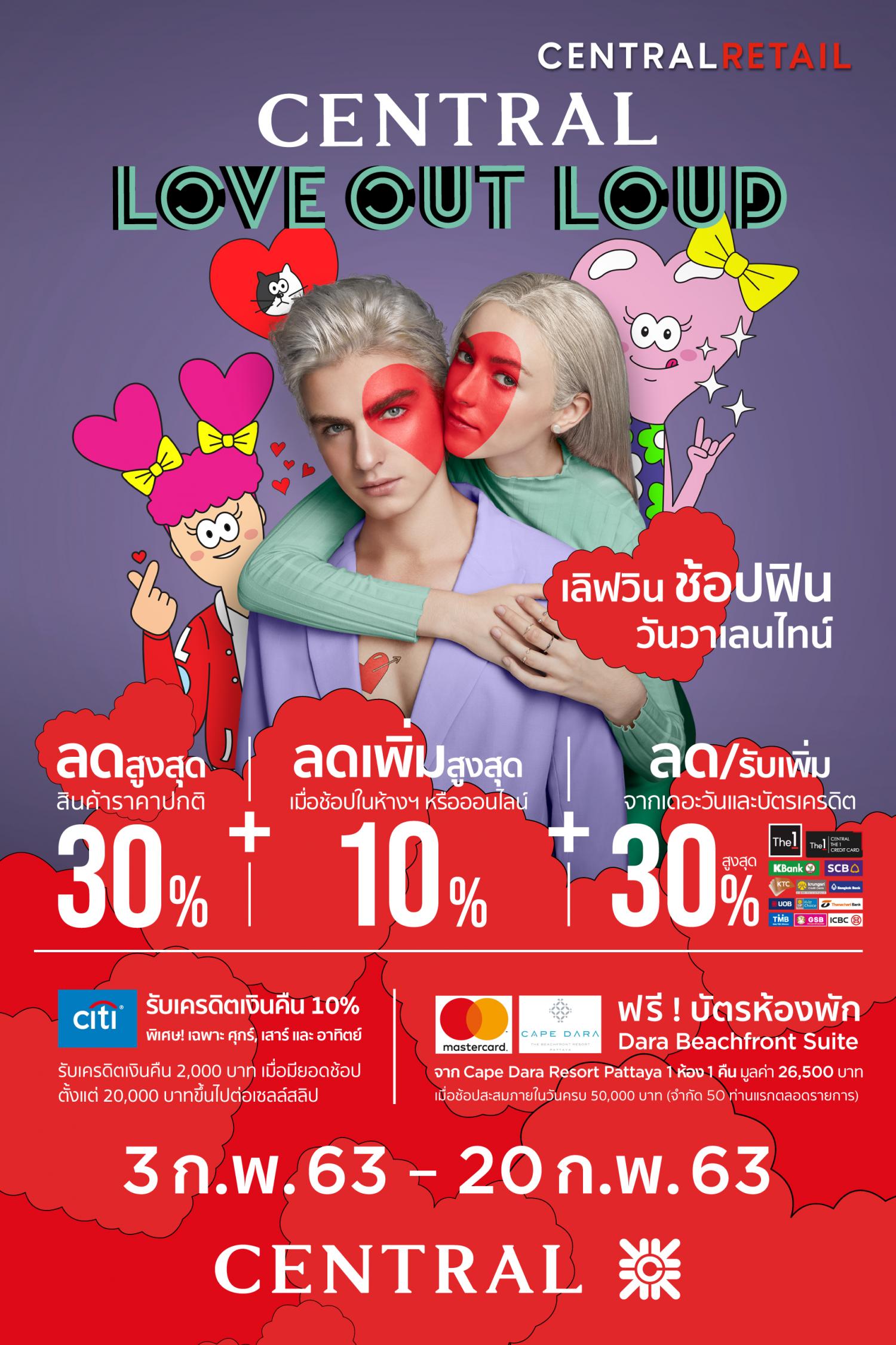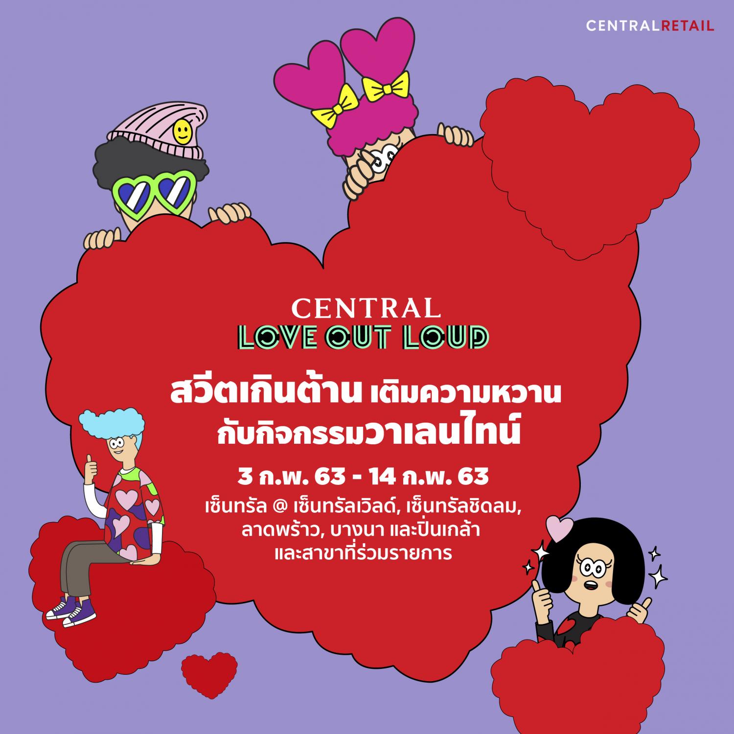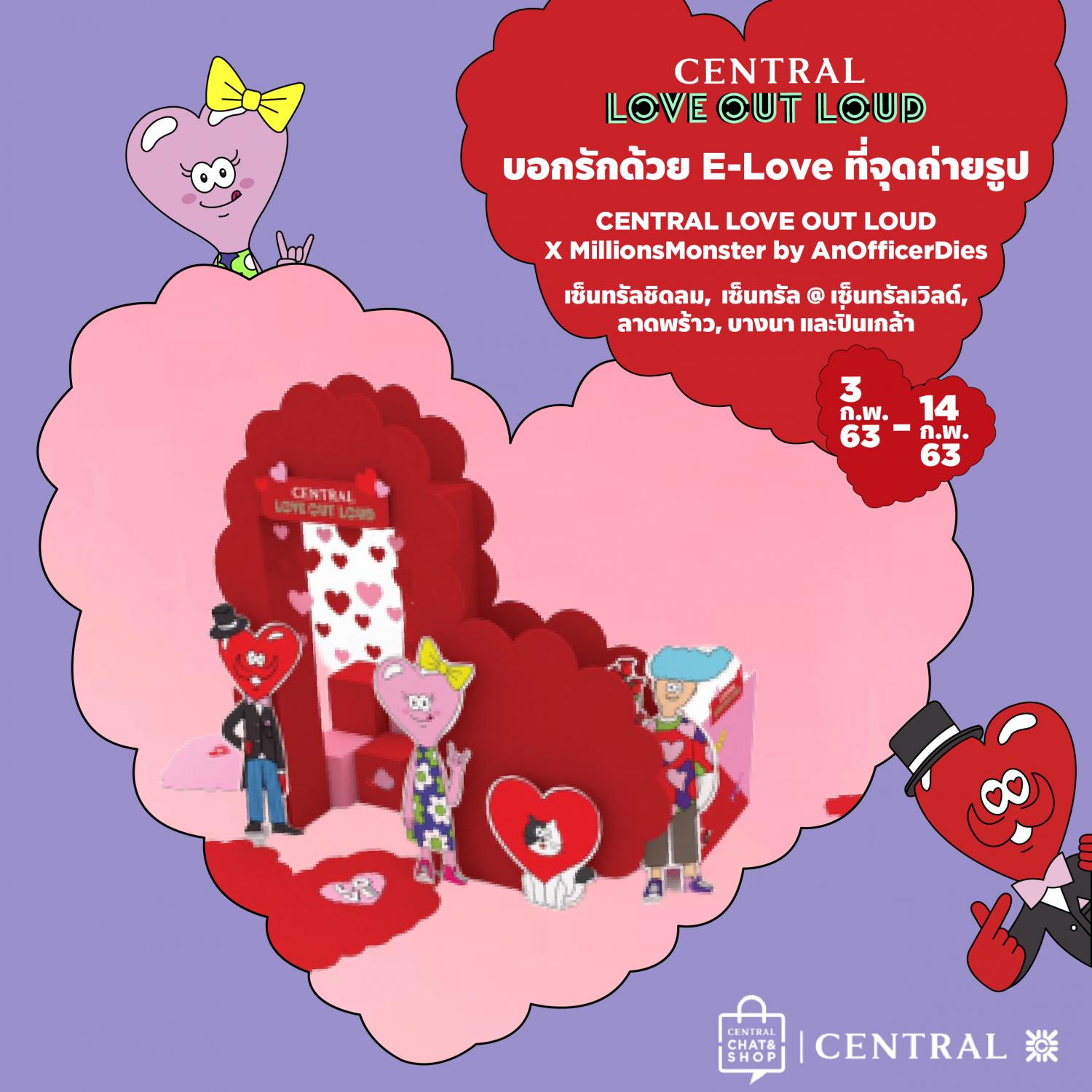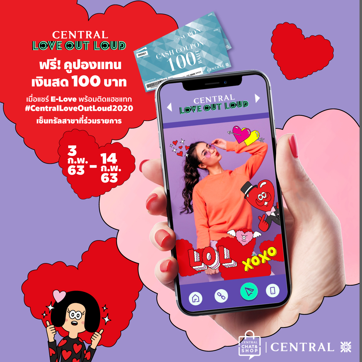 สำหรับปีนี้แคมเปญ CENTRAL LOVE OUT LOUD ยังส่งมอบโมเมนต์ดีๆ ให้คู่รักได้ร่วมสนุกกับกิจกรรม และตัวคาแรคเตอร์จาก LOL Peoples by MillonsMonster ได้มากขึ้นที่ห้างเซ็นทรัลพระราม 3, เวสต์เกต, แจ้งวัฒนะ, ฟิวเจอร์พาร์ค และอีสต์วิลล์ เพียงแชร์ภาพถ่ายจากกิจกรรม E-Love พร้อมติดแฮชแท็ก #CentralLoveOutLoud2020 รับฟรีทันทีคูปองแทนเงินสด 100 บาท
