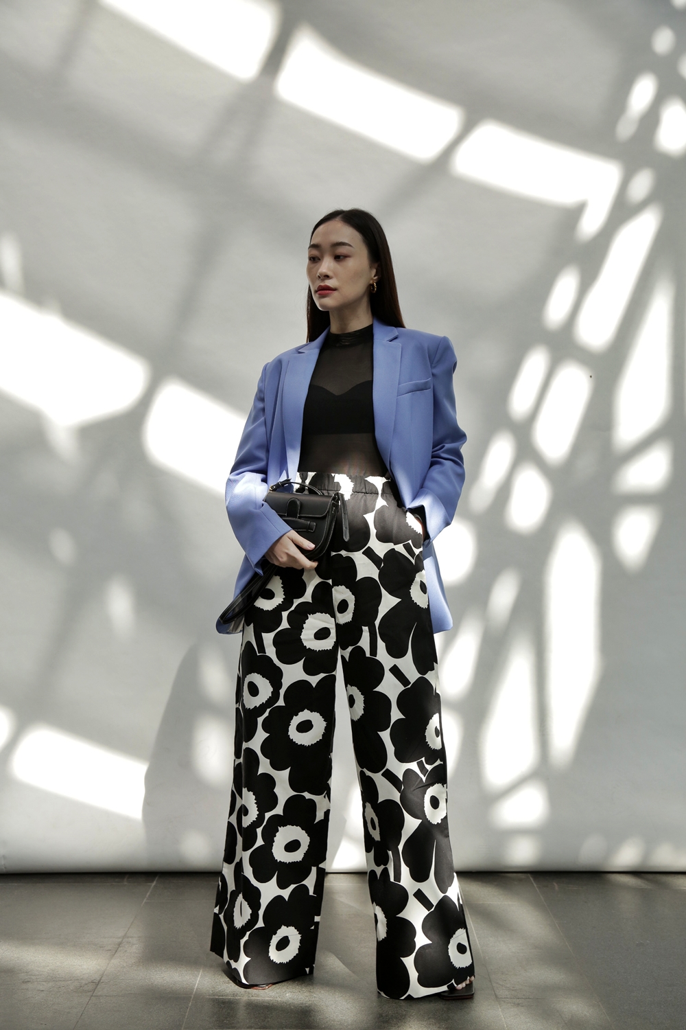 พิชฎ์สินี บุญมั่นพิพัฒน์ ที่วันนี้ใส่กางเกงลายดอกอุนิกโกะสีขาวดำจากคอลเล็คชั่นพรีฟอลล์ 2019 แมทช์กับสูทสีฟ้า เล่าถึงสไตล์การแต่งตัวแบบสาวมารีเมกโกะในแบบฉบับตัวเองว่า “ปกติชอบแต่งตัวเรียบร้อยสไตล์มินิมัล ถ้าท่อนล่างเป็นลายท่อนบนจะเป็นสีเรียบ ๆ จริง ๆ แล้วมารีเมกโกะจับคู่สีได้สวยทำให้ความเรียบง่ายดูมีเอกลักษณ์ขึ้นมาเมื่อสวมใส่ อย่างเช่นในคอลเล็คชั่นฟอลล์/วินเทอร์ 2019นี้ที่ได้จับคู่สีและปริ้นต์อย่างโดดเด่นเวลาใส่มารีเมกโกะชอบมีคนชมว่าสีสวย ลายน่ารัก ทำให้คนรอบข้างเห็นแล้วรู้สึกมีความสุข วันไหนรู้สึกแบบไหนก็สามารถถ่ายทอดผ่านชุดที่เลือกใส่ได้”