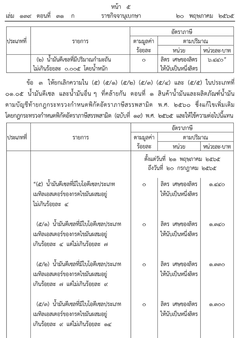 เว็บไซต์ราชกิจจานุเบกษาเผยแพร่กฎกระทรวงกําหนดพิกัดอัตราภาษีสรรพสามิต (ฉบับที่ 22) พ.ศ.2565 ประกาศลดภาษีดีเซลลิตรละ 5 บาทเป็นเวลา 2 เดือนมีผล 21 พ.ค.เป็นต้นไป