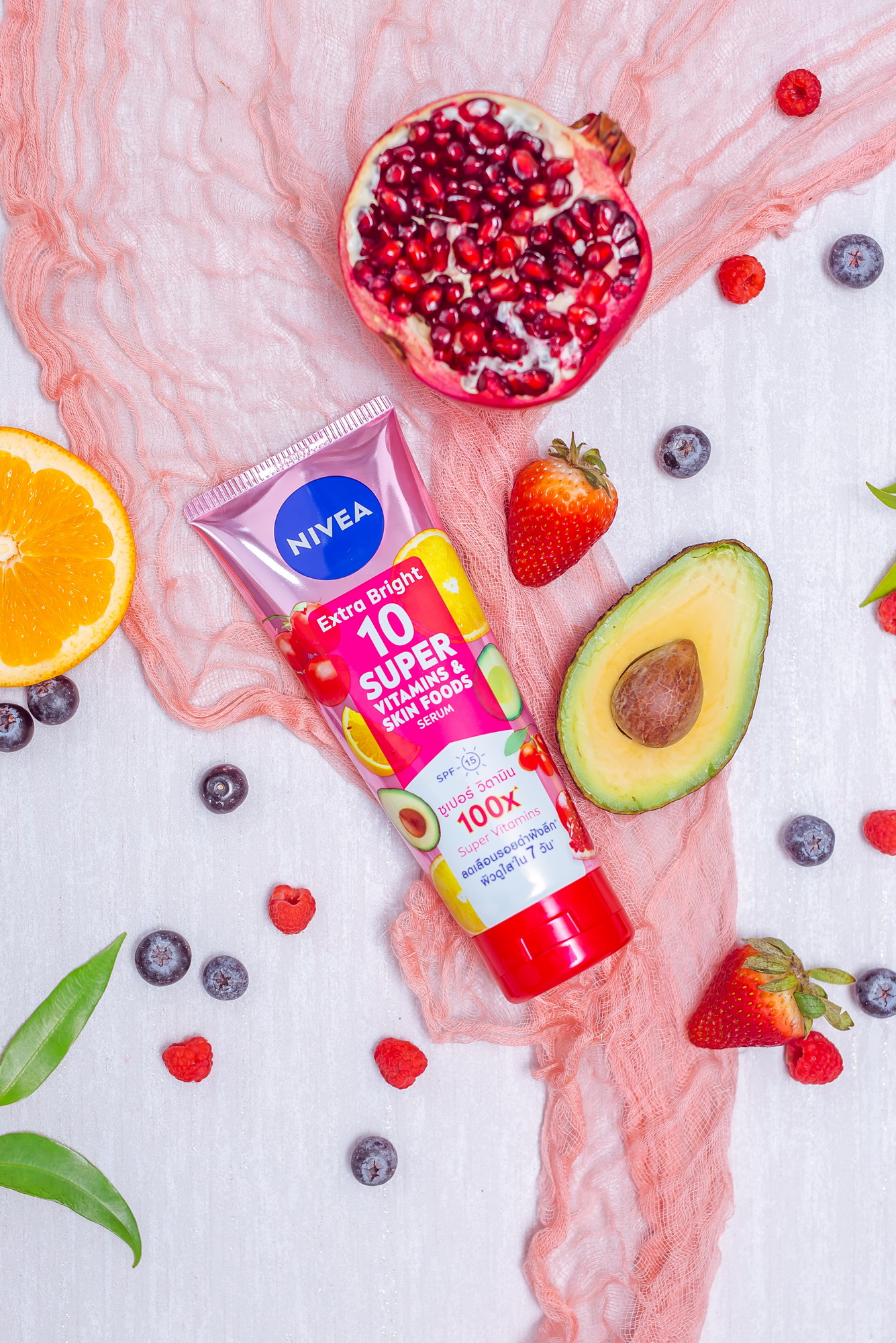 นีเวีย เอ็กซ์ตร้า ไบรท์ 10 ซูเปอร์ วิตามิน แอนด์ สกิน ฟู้ด เซรั่ม พร้อมช่วยปกป้องผิวจากการโดนแสงแดดทำร้ายด้วย SPF 15 ปกป้องผิวจากแสงแดด 15 เท่า4 ทั้งยังอุดมด้วยซูเปอร์วิตามิน 100 เท่า ที่ประกอบไปด้วยคุณค่าสารสกัดจากซูเปอร์เท็น ทั้ง วิตามิน 6 ชนิดและอาหารผิวอีก 4 ชนิด อย่าง วิตามิน A วิตามิน C วิตามิน E วิตามิน B3 วิตามิน B9 โปรวิตามิน B5 โกจิเบอร์รี่ ทับทิม น้ำมันอะโวคาโด และเลมอน ช่วยขจัดปัญหาผิวหมองคล้ำ รอยดำดื้อแก้ยาก และฟื้นบำรุงให้ผิวสุขภาพดี ชุ่มชื้นจากภายในดูกระจ่างใสอย่างเป็นธรรมชาติ ที่ได้รับการทดสอบจากกลุ่มผู้ใช้งานจริงว่าสามารถเห็นผลจริงได้ภายในหนึ่งสัปดาห์