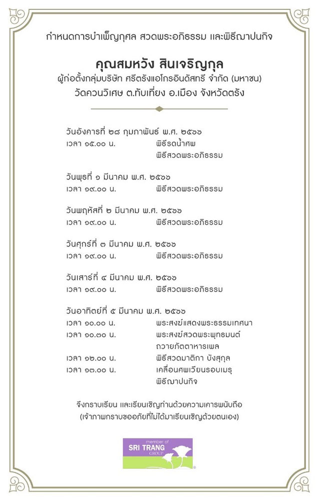 ทั้งนี้ ทางบริษัทฯ ได้แนบกำหนดการบำเพ็ญกุศล สวดพระอภิธรรม และพิธีฌาปนกิจ มาใน e-mail ฉบับนี้เรียบร้อยแล้วครับ/ค่ะ