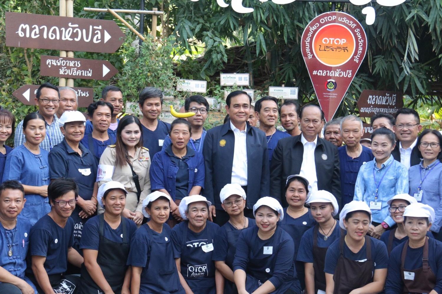จากนั้นเวลา 15.35 น. นายกรัฐมนตรี เยี่ยมชมศูนย์ OTOP คอมเพล็กซ์พุแค (ศูนย์จำหน่ายและจำหน่ายสินค้า TOP ทั่วประเทศ) และศูนย์ฝึกอาชีพ OTOP ซึ่งเป็นต้นแบบศูนย์เรียนรู้ด้านการบริหารจัดการ OTOP ครบวงจรใหญ่ที่สุดในประเทศไทย ก่อนนั่งรถรางเพื่อมาเยี่ยมชมตลาดหัวปลี “ตลาดสร้างสุข ชุมชนร่วมสร้าง”(โครงการต้นแบบที่ดีในการดำเนินโครงการชุมชนท่องเที่ยว OTOP นวัตวิถี) โดยมี พล.อ.อนุพงษ์ เผ่าจินดา รมว.มหาดไทย นายนิสิต จันทร์สมวงศ์ อธิบดีกรมการพัฒนาชุมชน รวมถึง ผู้สมัครส.ส.พรรคพลังประชารัฐร่วมต้อนรับ
