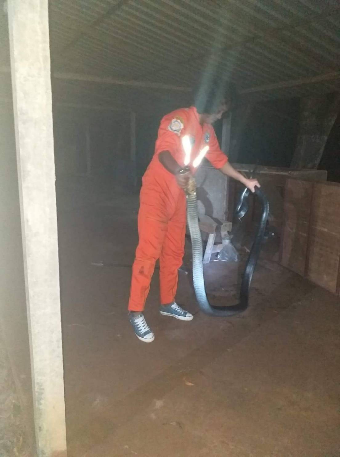 ทั้งนี้ แผงขายของดังกล่าว พบงูจงอางขนาดใหญ่ ขดนอนอยู่ใต้ตู้ไม้วางเครื่องดื่ม เจ้าหน้าที่กู้ภัยและนักวิจัยชาวต่างชาติ จึงช่วยกันจับงูด้วยความระมัดระวัง เนื่องจากงูพยายามเลื้อยหลบและขู่ตลอดเวลา คาดว่า จะหวาดกลัวเกรงคนจะทำร้าย จึงทำให้มีอาการดุร้าย ทำให้จับตัวได้ค่อนข้างยากลำบาก ต้องใช้เวลาประมาณ 20 นาที จึงสามารถงูจงอางตัวนี้ไว้ได้ ซึ่งเจ้าหน้าที่ฯ ได้ตรวจสอบลักษณะโดยรวม พบว่า มีเห็บหมัดป่าเกาะอยู่ที่บริเวณหัวของงู จึงสันนิษฐานว่า น่าจะเลื้อยออกมาจากป่าเพื่อมาหาอาหาร จากนั้น จึงนำไปชั่งน้ำหนักได้ 6 กิโลกรัม ขนาดความยาวประมาณ 4.50 เมตร