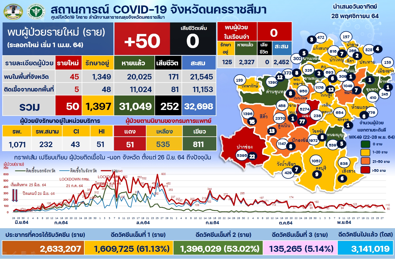 เมื่อวันที่ 28 พ.ย. พ.ย. คณะกรรมการโรคติดต่อจังหวัดนครราชสีมาได้รายงานถึงสถานการณ์การแพร่ระบาดของโรคโควิด-19 ในพื้นที่วันนี้ว่า พบผู้ป่วยติดเชื้อไวรัสโควิด-19 จำนวน 50 ราย แบ่งเป็นติดเชื้อภายในจังหวัด 45 ราย ติดเชื้อภายนอกจังหวัด 5 ราย โดยเดินทางกลับมาจากพื้นที่เสี่ยง คือ เกทม. 3 ราย และกาฬสินธุ์ 2 ราย ขณะยอดสะสมแล้ว 32,698 ราย รักษาหายแล้ว 31,049 ราย กำลังรักษาอยู่ 1,397 ราย นอกจากนี้ยังพบผู้เสียชีวิตจากโควิด-19
