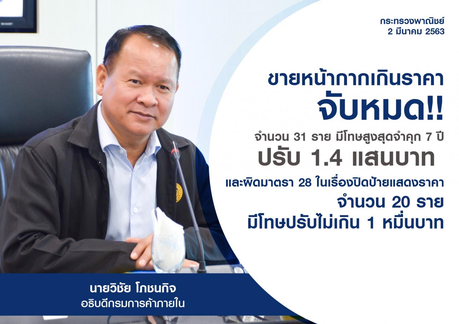 สำหรับ การจับกุมผู้ที่ค้ากำไรเกินควร ล่าสุดจับกุมได้แล้ว 51 ราย มีทั้งผู้ค้าทั่วไปและค้าออนไลน์ โดยส่งดำเนินคดีความผิดตามมาตรา 29 พ.ร.บ.ว่าด้วยราคาสินค้าและบริการ จำนวน 31 ราย มีโทษสูงสุดจำคุก 7 ปี ปรับ 1.4 แสนบาท และผิดมาตรา 28 ในเรื่องปิดป้ายแสดงราคา 20 ราย มีโทษปรับไม่เกิน 1 หมื่นบาท