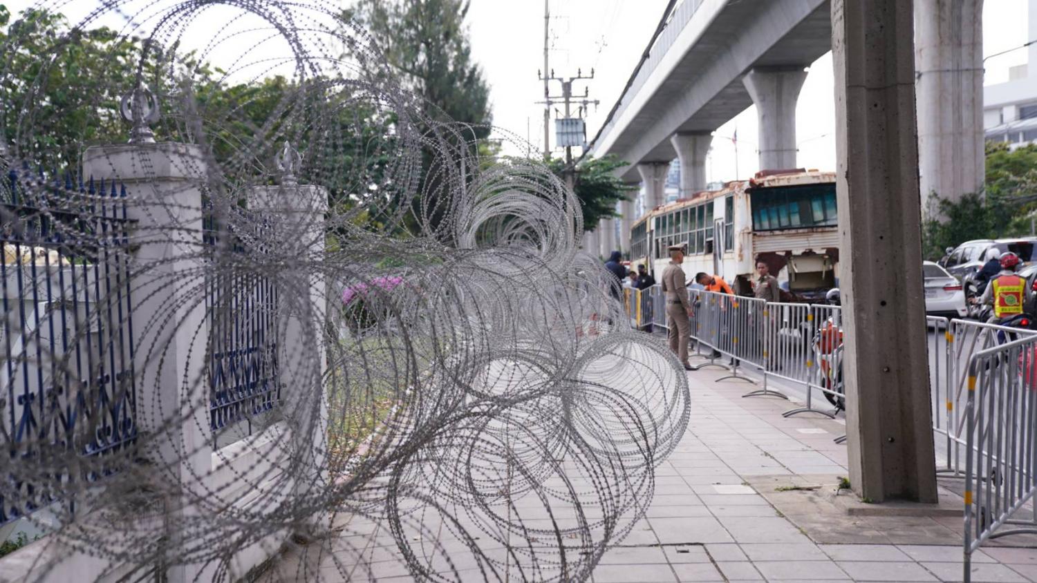 เจ้าหน้าที่เตรียมรับมือม็อบราษฎรชุมนุมที่กรมทหารราบที่ 11 นำลวดหนามกั้นทางเข้า พร้อมใช้รถบัสจอดขวาง นำผ้าใบมาคลุมป้ายป้องกันผู้ชุมนุมละเลงสี