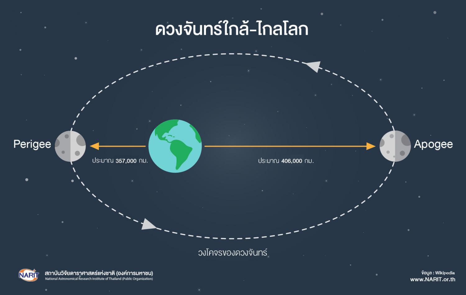 ทั้งนี้ ดวงจันทร์โคจรรอบโลกเป็นวงรี 1 รอบ ใช้เวลาประมาณ 27.3 วัน ในแต่ละเดือนจะมีทั้งวันที่ดวงจันทร์ใกล้โลกและไกลโลก ตำแหน่งที่ดวงจันทร์ใกล้โลกที่สุด เรียกว่า เปริจี (Perigee) มีระยะห่างเฉลี่ยประมาณ 357,000 กิโลเมตร และตำแหน่งที่ดวงจันทร์ไกลโลกที่สุด เรียกว่า อะโปจี (Apogee) มีระยะห่างเฉลี่ยประมาณ 406,000 กิโลเมตร การที่ผู้คนบนโลกมองเห็นดวงจันทร์เต็มดวงในคืนที่ดวงจันทร์โคจรเข้ามาใกล้หรือไกลโลกมีขนาดที่แตกต่างกัน นับเป็นเหตุการณ์ปกติที่สามารถอธิบายได้ตามหลักการทางวิทยาศาสตร์